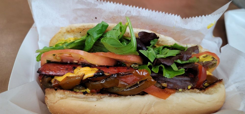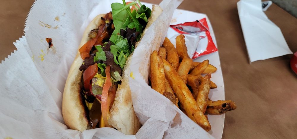 Halal beef link, with mayo, mustard, cheese, peppers, lettuce, tomatoes, and onions wrapped in a soft roasted bun. Served with fries.